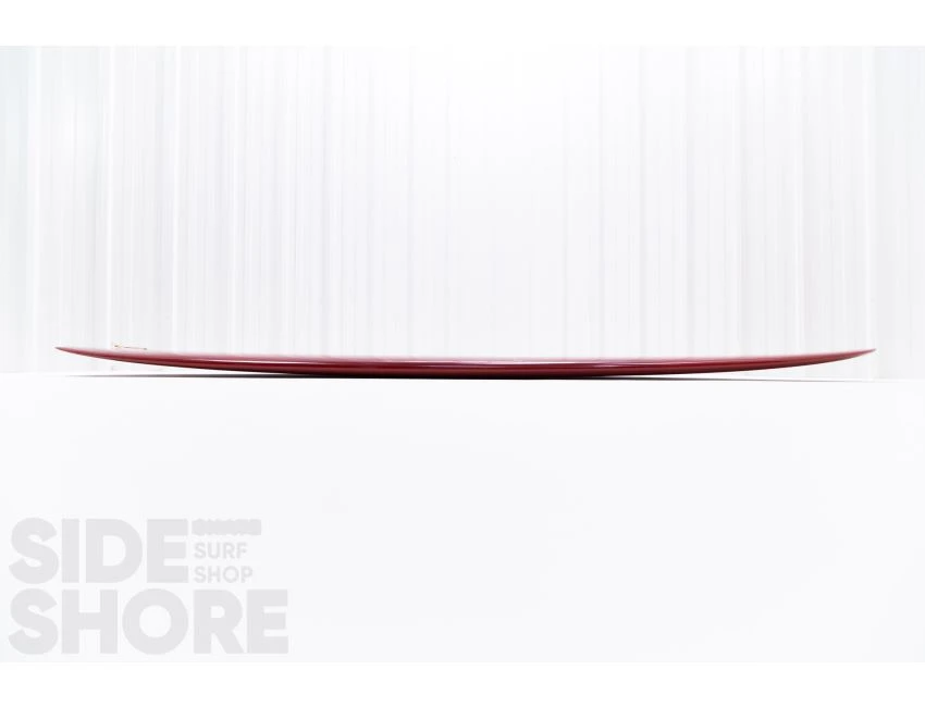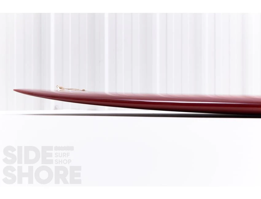 « J’ai décidé d’aborder son concept dans une direction différente et de développer en un longboard hybride avec des caractéristiques de performance. Je voulais une planche avec de la glisse pour contourner les sections critiques tout en maintenant la vitesse, ainsi que la capacité de faire des virages plus serrés plus rapides, dans un sens « enlever les freins », ce qui est courant avec la plupart des noseriders. J’ai ajouté du egde dans la queue qui se transforme en un rail 60/40 au milieu. J’ai conservé certains attributs de l’outline mais je l’ai rendu sensiblement plus étroit dans l’ensemble ; en particulier dans le nez et la queue, tout en gardant son nez pointu caractéristique. Avoir la pointe large légèrement vers l’avant en fait toujours un excellent noserider même avec le nez plus étroit. Enfin, nous avons déplacé le volume du pont dans le nez, compensant le besoin de la largeur supplémentaire dans la version originale. »